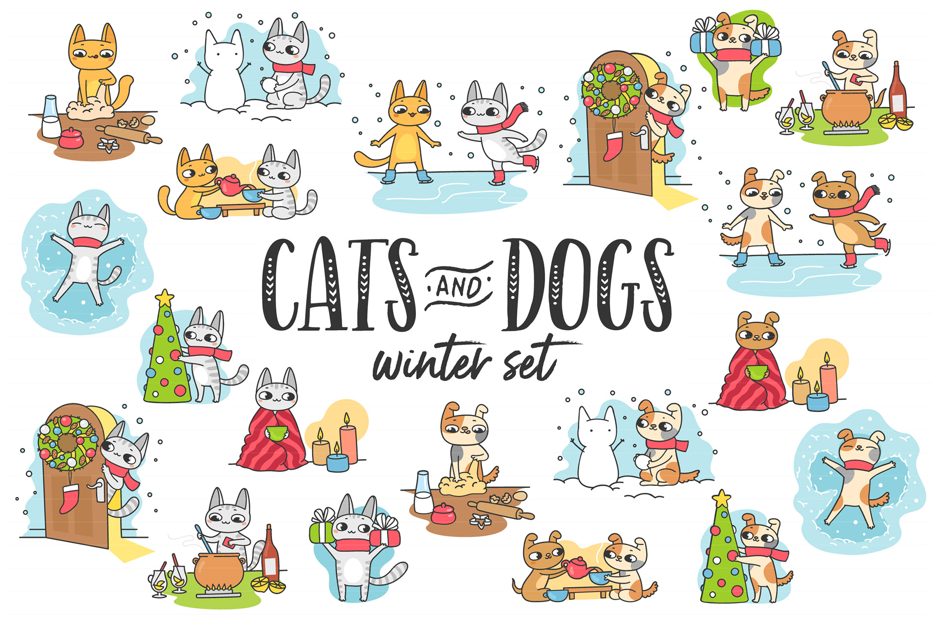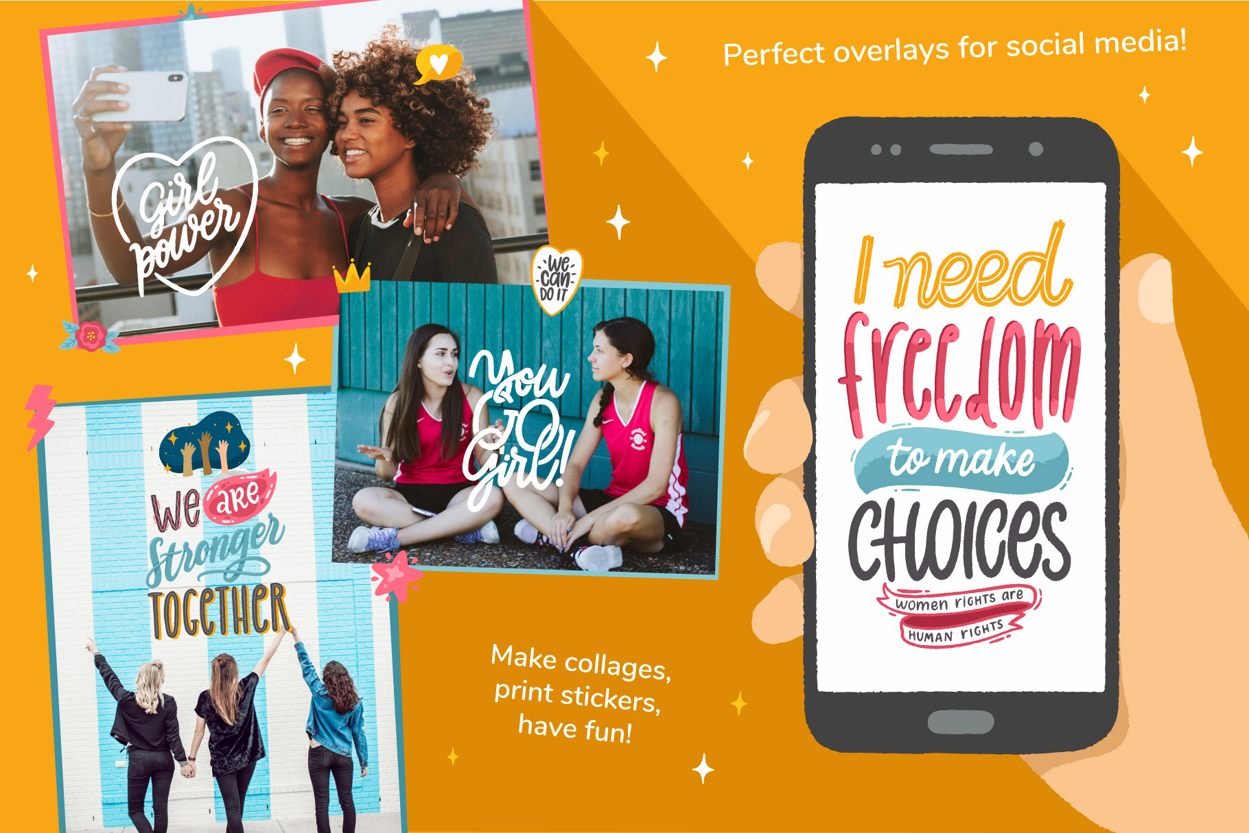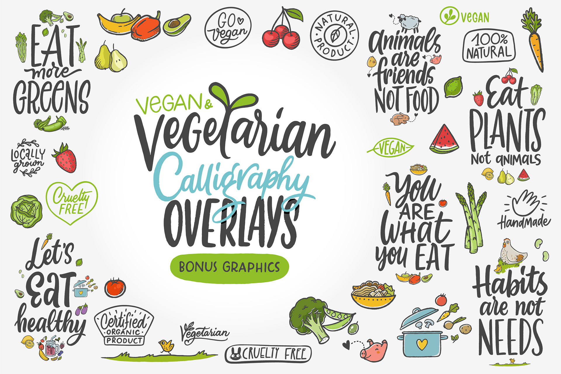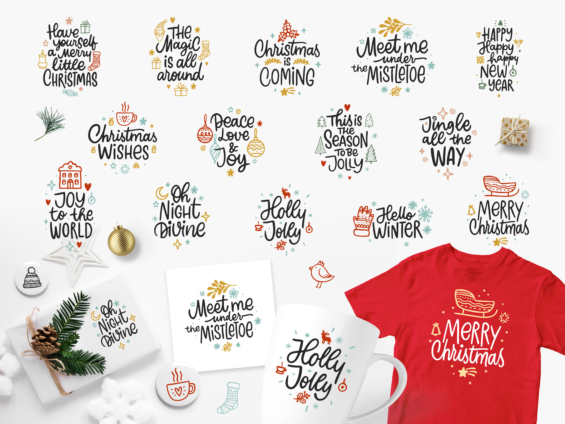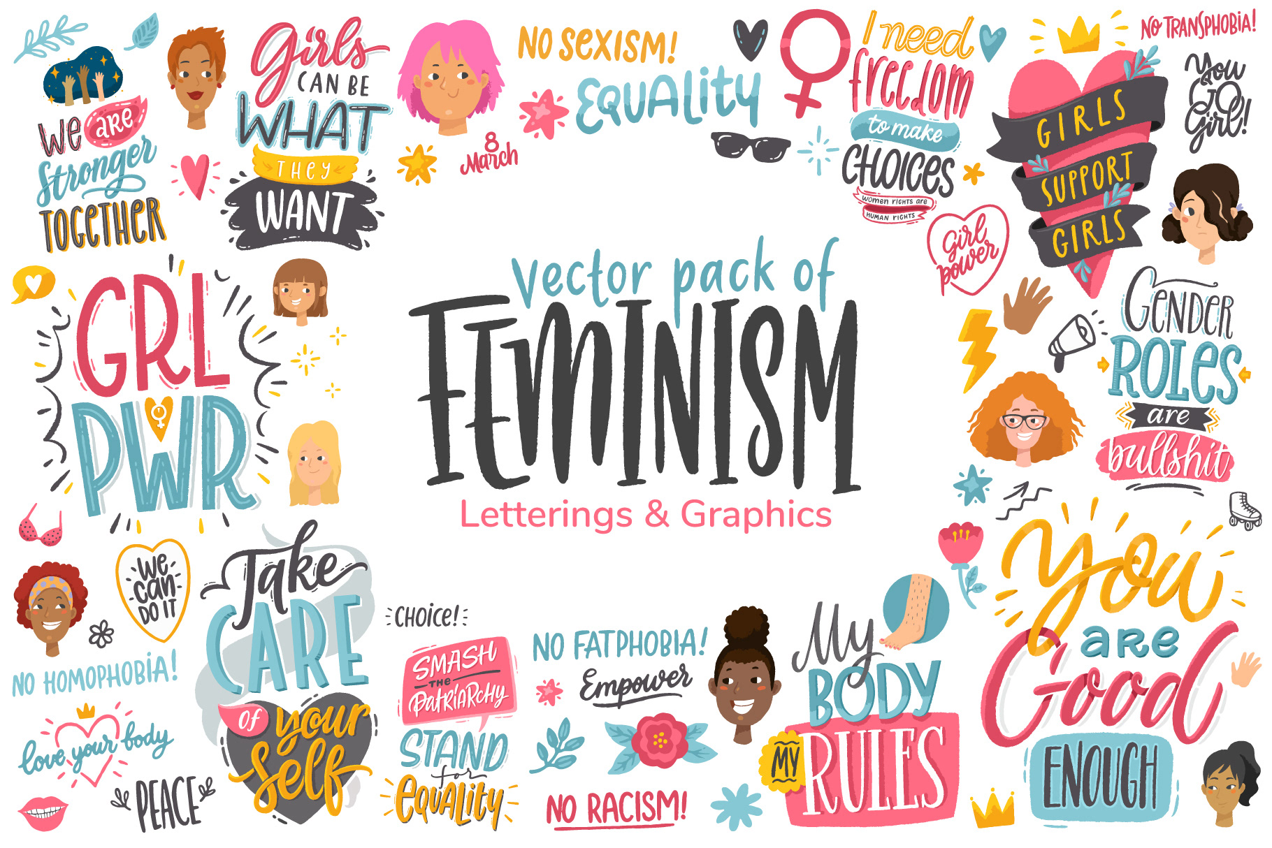 These collections combine expressive typography, playful characters, and decorative graphics designed for print, web, and social media use.