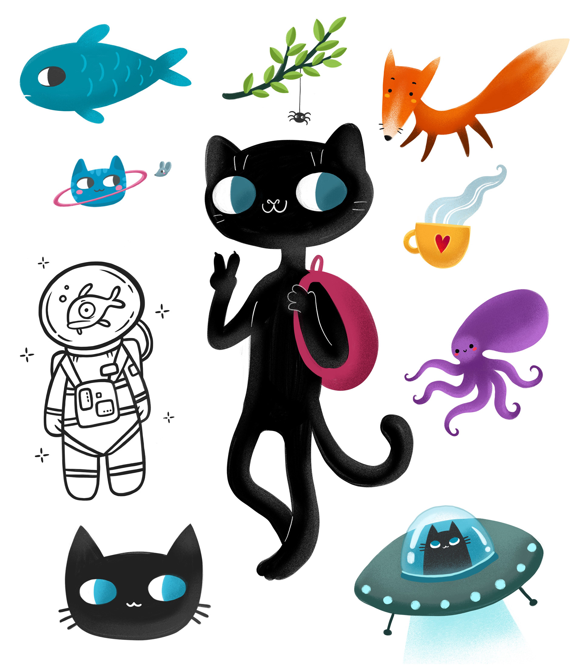 A mix of commercial and personal illustrations – from playful character concepts and editorial scenes to product and packaging artwork.