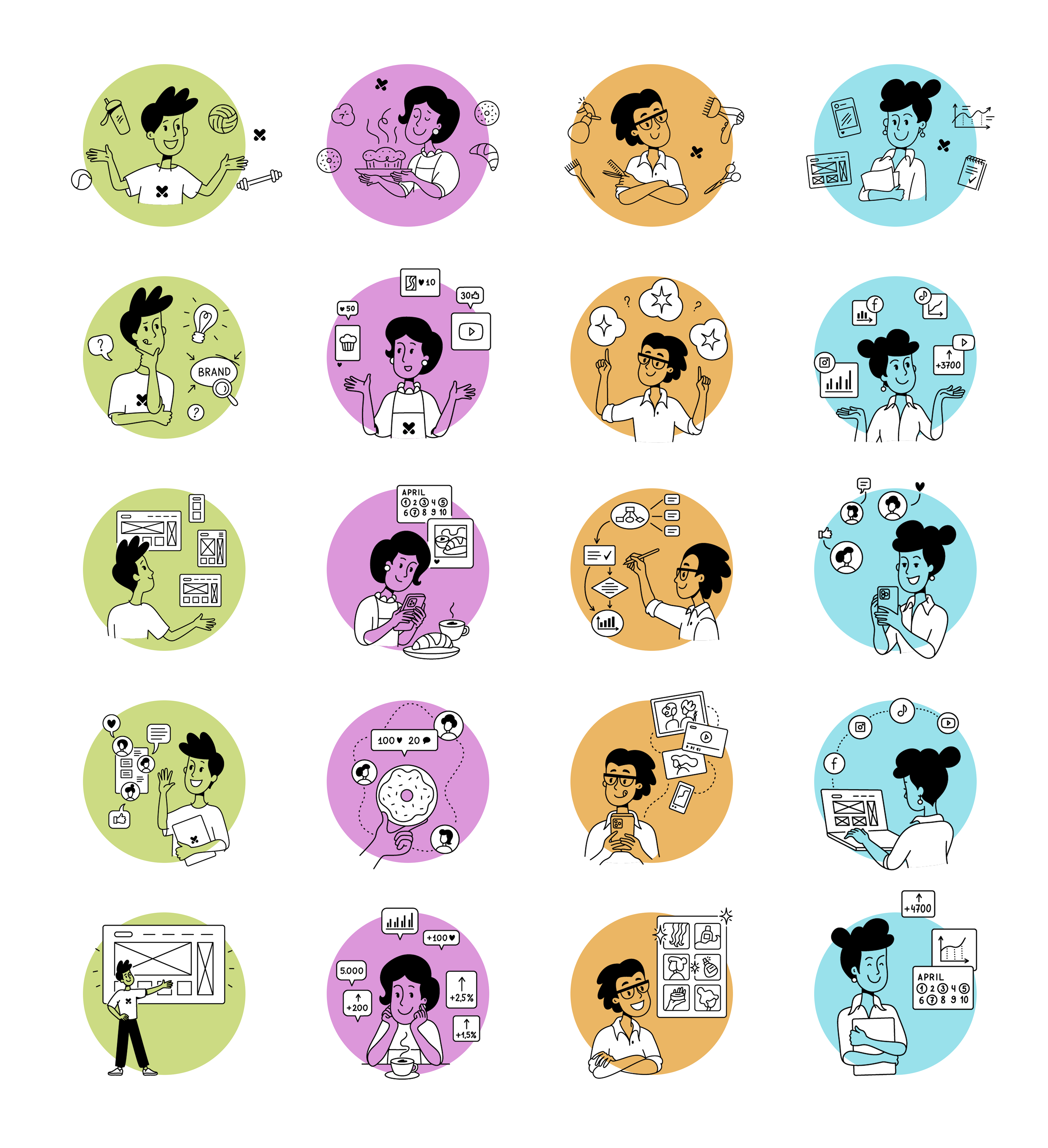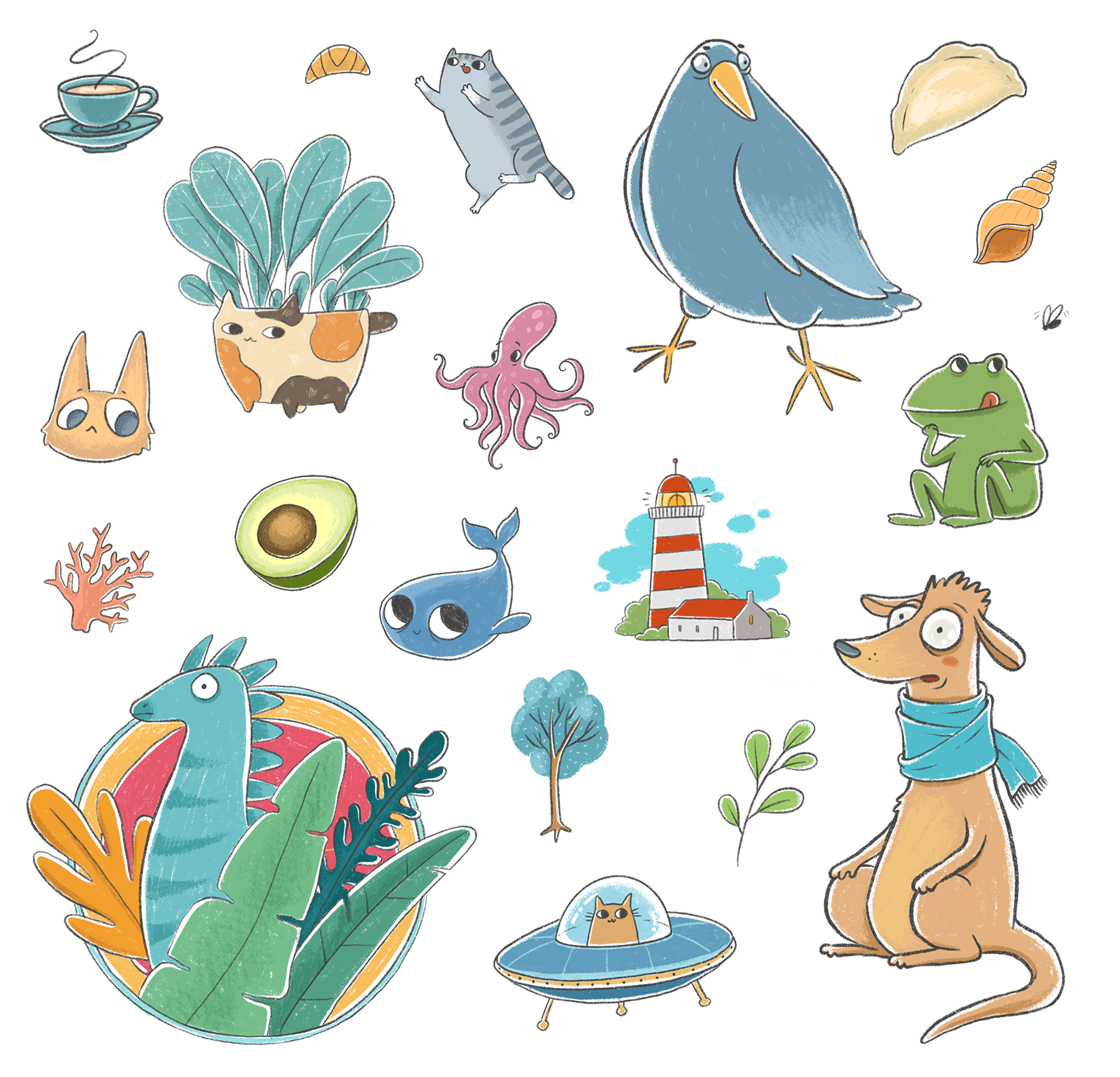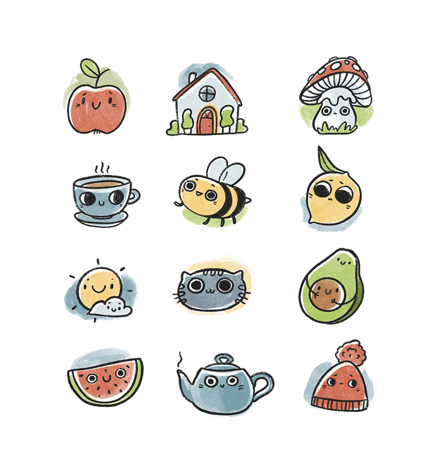 Playful illustration sets created for branding, packaging, and digital use – from character stickers and mini icons to themed collections for children’s and lifestyle brands.