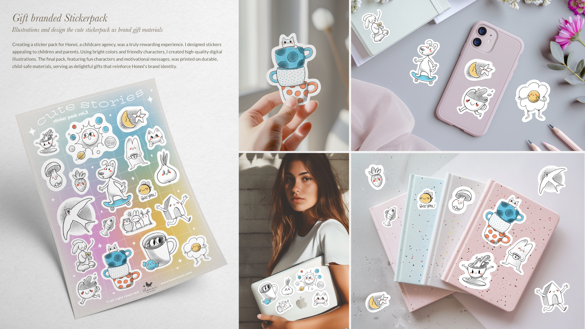 Projects for brands such as “Honni Childcare Agency”, “Little Bean Studio”, and various digital asset collections.